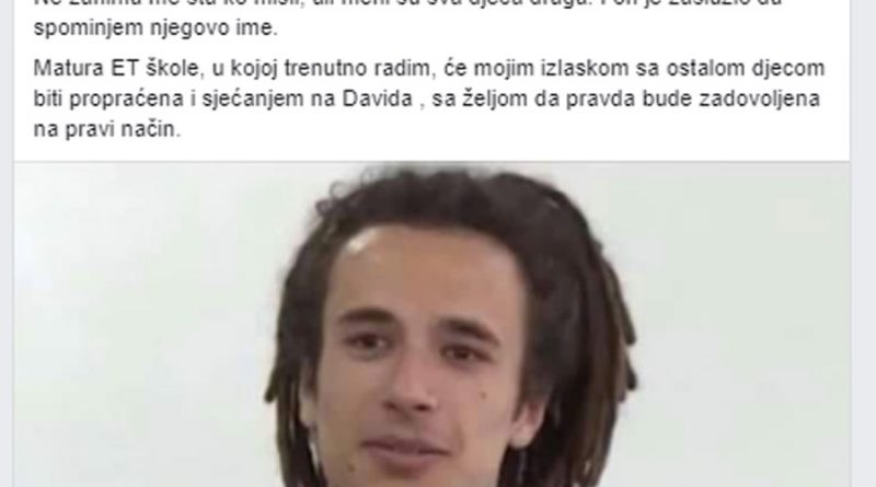 BiH News Potresna poruka profesorke Elektrotehničke škole Banjaluka: “Današnji dan posvećujem Davidu…” May 24, 2019May 24, 2019 Redakcija 1 0 Comments Pravda za Davida Marijana Pećanac, profesorka Elektrotehničke škole “Nikola Tesla” u Banjaluci koju je pohađao i tragično stradali David Dragičević objavila je potresnu poruku na društvenoj mreži “Fejsbuku” povodom maturske večeri učenika ove škole. Izvor:buka magazin Please follow and like us: Share this: