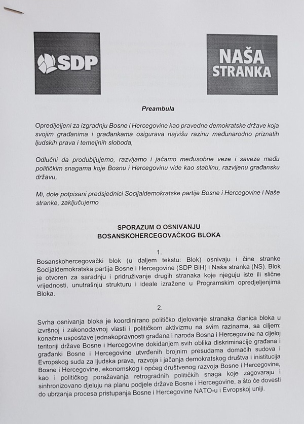 SDP BiH i Naša stranka danas su u Sarajevu potpisale Sporazum o osnivanju Bosanskohercegovačkog bloka.